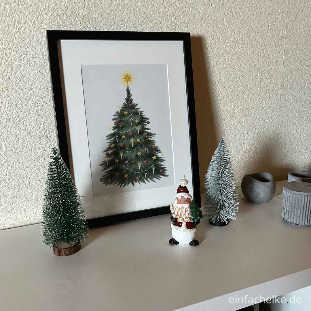 Dieses Jahr gab es sogar für mein Büro oben ein Bild. Ich sah diesen schönen Tannenbaum und dachte, das Bild möchte ich haben. Das kommt dann oben ins Büro. Damit ich wenn ich Homeoffice habe, auch etwas weihnachtliches habe. Nicht zuviel und nicht zu wenig. Dann noch die Tannenbäume daneben und so gefällt es mir. Von meinem Schreibtisch habe ich einen schönen Blick auf das Bild. Meinen Kerzennnikolaus noch dazu. Inzwischen begleitet er mich schon fast 30 Jahre oder 30 Weihnachten.